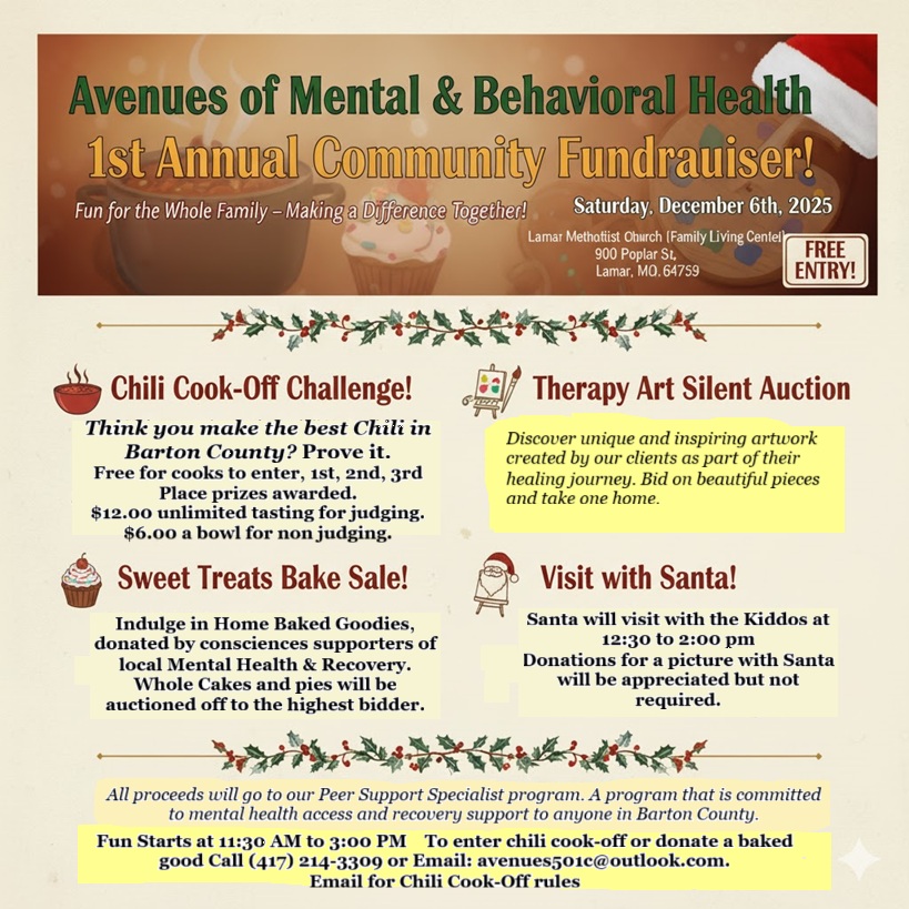 Fun Starts at 11:30 AM to 3:00 PM To enter chili cook-off or donate a baked good Call (417) 214-3309 or Email: avenues501c@outlook.com. Email for Chili Cook-Off rules